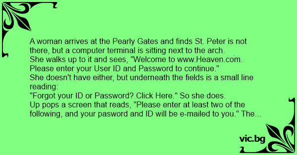 A woman arrives at the Pearly Gates and finds St. Peter is not there, but a computer terminal is sitting next to the arch.