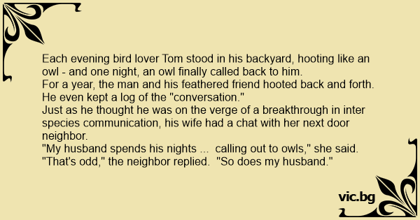 Just as he thought he was on the verge of a breakthrough in inter species communication, his wife had a chat with her next door neighbor.