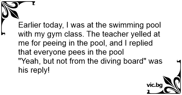 Earlier today, I was at the swimming pool with my gym class. The teacher yelled at me for peeing in the pool, and I replied that everyone pees in the pool