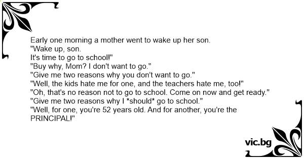 Reggel van. Az anya kelti a fiát. - Fiam, kelj fel, iskolába kell menned! - Nem akarok! - Mondj 2 nyomós érvet, hogy miért nem! - 1. Az összes gyerek utál, 2. Az összes tanár utál! - Ez nem nyomós...