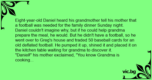 Eight-year-old Daniel heard his grandmother tell his mother that a football was needed for the family dinner Sunday night. Daniel couldn't imagine why, but if he could help grandma prepare the meal, he would. But he didn't have a football, so he went over to Greg's house and traded 50 baseball cards for an old deflated football. He pumped it up, shined it and placed it on the kitchen table waiting for grandma to discover it.