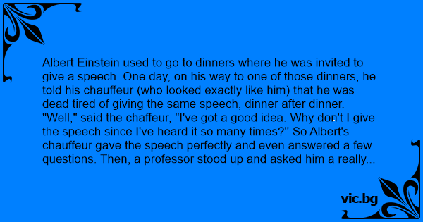 "Well," said the chaffeur, "I've got a good idea. Why don't I give the speech since I've heard it so many times?'' So Albert's chauffeur gave the speech perfectly and even answered a few questions. Then, a professor stood up and asked him a really tough question about anti-matter which the chauffeur couldn't answer