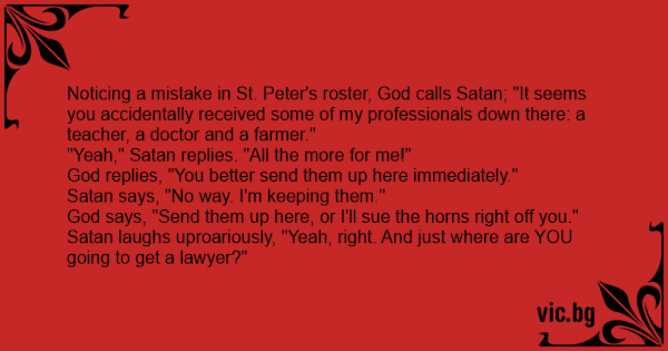 Noticing a mistake in St. Peter's roster, God calls Sатаn; "It seems you accidentally received some of my professionals down there: a teacher, a doctor and a farmer."