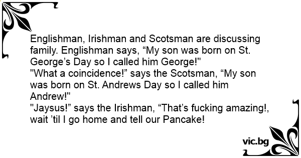 Englishman, Irishman and Scotsman are discussing family. Englishman says, “My son was born on St. George’s Day so I called him George!"