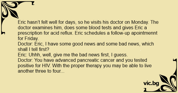 Doctor: Eric, I have some good news and some bad news, which shall I tell first?
