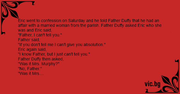 Eric went to confession on Saturday and he told Father Duffy that he had an affair with a married woman from the parish. Father Duffy asked Eric who she was and Eric said,