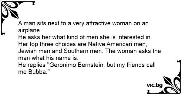 Her top three choices are Native American men, Jewish men and Southern men. The woman asks the man what his name is.