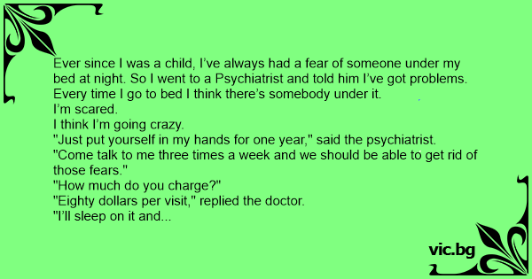 “Ik heb een probleem, dokter. Iedere keer als ik naar bed ga, denk ik dat er iemand onder zit. Ik ben bang en ik denk dat ik gek word.” “Kom een jaar lang in behandeling bij mij,” zegt de...