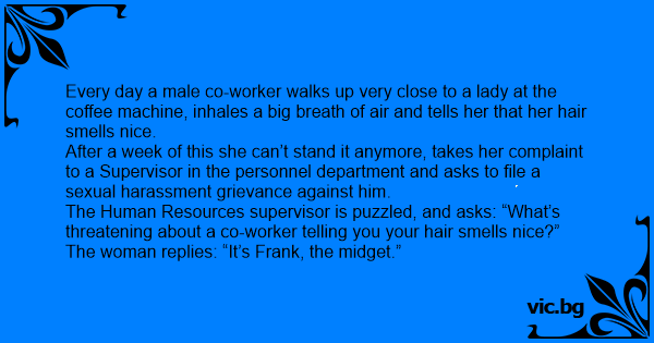 One day a women walks into work in a short skirt. As she’s walking to her desk she gets stopped by a co-worker, who says, “Your hair smells really nice today.” She grimaces and stomps into her manager’s office. She says,”I want to file a sexual harassment complaint!” and then relates what...