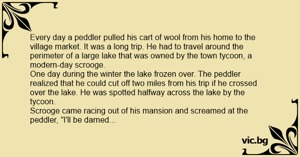 Every day a peddler pulled his cart of wool from his home to the village market. It was a long trip. He had to travel around the perimeter of a large lake that was owned by the town tycoon, a modern-day scrooge.