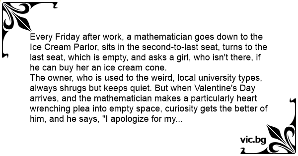 Every Friday after work, a mathematician goes down to the Ice Cream Parlor, sits in the second-to-last seat, turns to the last seat, which is empty, and asks a girl, who isn't there, if he can buy her an ice cream cone.