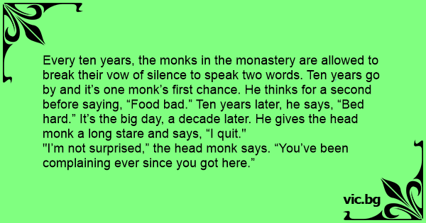 En man beslutade att bli munk och sökte upp ett kloster där huvudregeln var tystnad. Han fick bara säga två ord under varje decennium. Efter tio år kallade abboten honom till sig och sa: - Du kan...