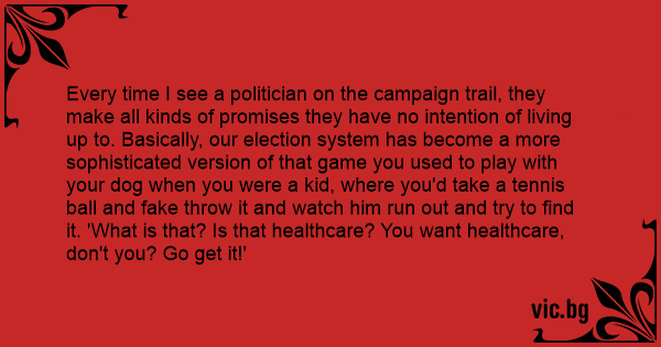 Every time I see a politician on the campaign trail, they make all kinds of promises they have no intention of living up to. Basically, our election system has become a more sophisticated version of that game you used to play with your dog when you were a kid, where you'd take a tennis ball and fake throw it and watch him run out and try to find it. 'What is that? Is that healthcare? You want healthcare, don't you? Go get it!'