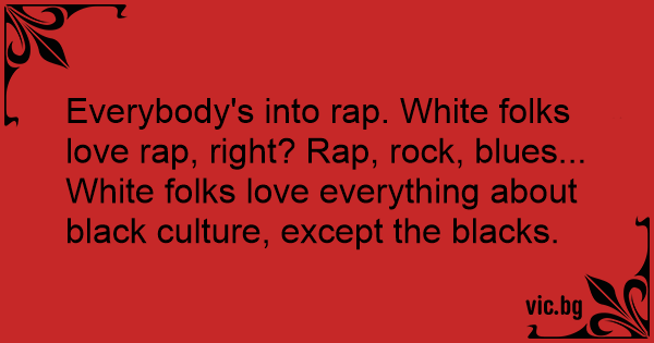 Everybody's into rap. White folks love rap, right? Rap, rock, blues... White folks love everything about black culture, except the blacks.