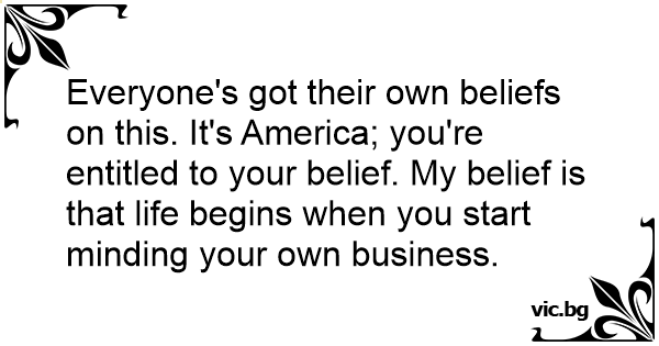 Everyone's got their own beliefs on this. It's America; you're entitled to your belief. My belief is that life begins when you start minding your own business.