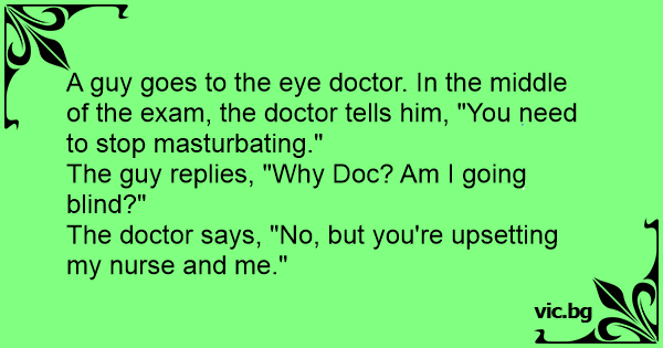 Доктор към пациент: - Трябва да спрете да мастурбирате? - Защо, докторе? - Защото ми пречи да ви прегледам.