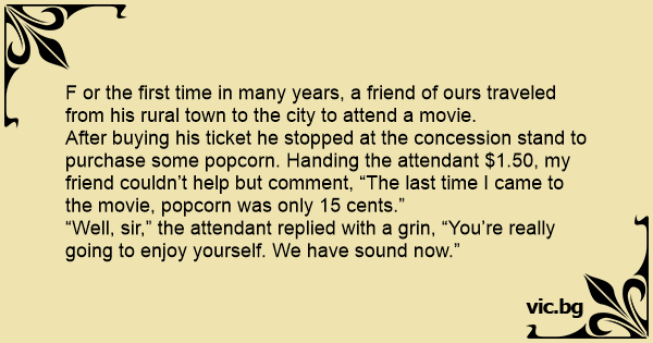 “Well, sir,” the attendant replied with a grin, “You’re really going to enjoy yourself. We have sound now.”