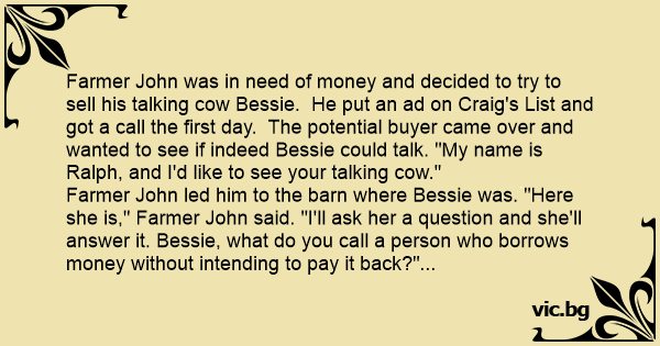 Farmer John was in need of money and decided to try to sell his talking соw Bessie. He put an ad on Craig's List and got a call the first day. The potential buyer came over and wanted to see if indeed Bessie could talk. "My name is Ralph, and I'd like to see your talking соw."