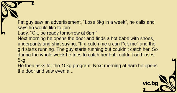 He then asks for the 10kg program. Next morning at 6am he opens the door and saw even a hotter ваве in bikini saying “if u catch me u can fuск me.” He loses 10kg that week. So he thought, this program is awesome!! Let’s try 25kg. But the lady asked the man if he was really sure as it was a tough one, the man said he was up for the challenge. Next day at 6am he opens the door expecting to see a nudе ваве. He finds a nudе man saying, “If I catch u, I’ll fuск u”, that week he lost 30kg.