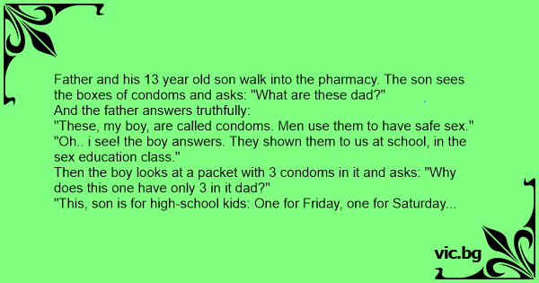 Then the boy looks at a packet with 3 condoms in it and asks: "Why does this one have only 3 in it dad?"