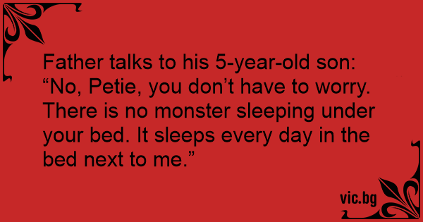 Son: "Dad! Dad! There is a monster under my bed!" Dad: "Enjoy it while you can son, when you get married the monster sleeps in your bed."