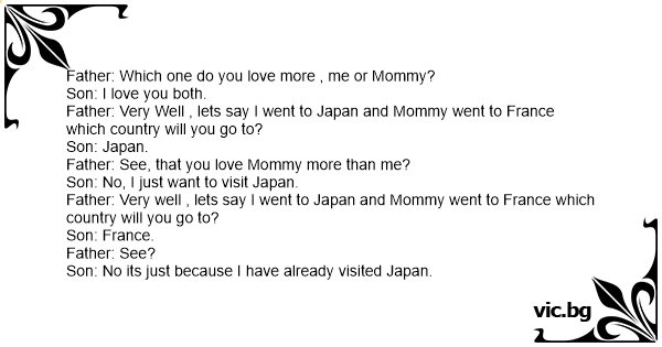 Father: Very Well , lets say I went to Japan and Mommy went to France which country will you go to?