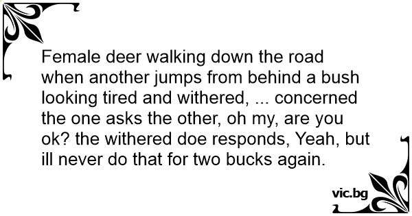 Female deer walking down the road when another jumps from behind a bush looking tired and withered, ... concerned the one asks the other, oh my, are you ok? the withered doe responds, Yeah, but ill never do that for two bucks again.