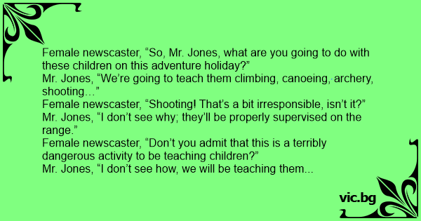 Female newscaster, “So, Mr. Jones, what are you going to do with these children on this adventure holiday?”
