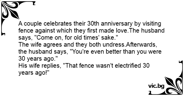 A couple celebrates their 30th anniversary by visiting fence against which they first made love.The husband says, "Come on, for old times' sake."