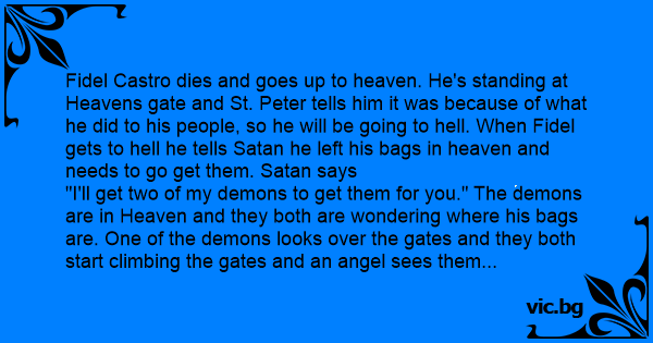 Fidel Castro dies and goes up to heaven. He's standing at Heavens gate and St. Peter tells him it was because of what he did to his people, so he will be going to hеll. When Fidel gets to hеll he tells Sатаn he left his bags in heaven and needs to go get them. Sатаn says