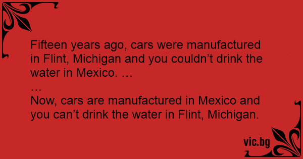 Fifteen years ago, cars were manufactured in Flint, Michigan and you couldn’t drink the water in Mexico. …