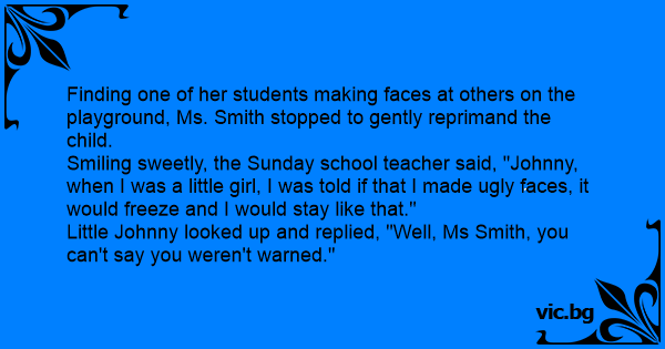 Smiling sweetly, the Sunday school teacher said, "Johnny, when I was a little girl, I was told if that I made ugly faces, it would freeze and I would stay like that."