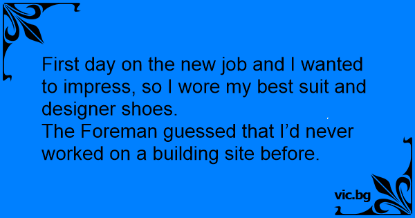 First day on the new job and I wanted to impress, so I wore my best suit and designer shoes.<br />The Foreman guessed that I’d never worked on a building site before.