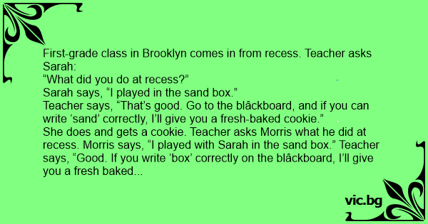 She does and gets a cookie. Teacher asks Morris what he did at recess. Morris says, “I played with Sarah in the sand box.” Teacher says, “Good. If you write ‘box’ correctly on the blâckboard, I’ll give you a fresh baked cookie.” Morris does, and gets a cookie. Teacher then asks Mustaffa Abdul Machmoud what he did at recess. He says, “I tried to play with Sarah and Morris, but they threw rocks at me.” Teacher says, “Threw rocks at you? That sounds like blatant racial discrimination. If you can go the blâckboard and write ‘blatant racial discrimination’ I’ll give you a cookie.