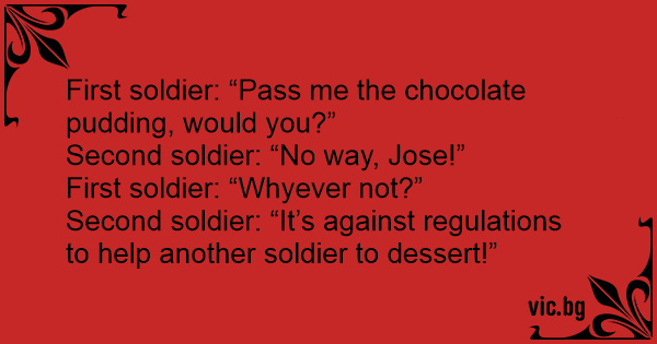 First soldier: “Pass me the chocolate pudding, would you?”