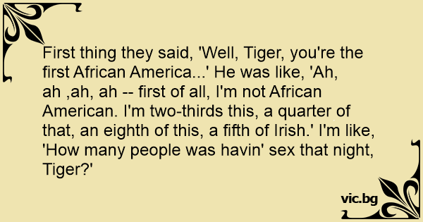 First thing they said, 'Well, Tiger, you're the first African America...' He was like, 'Ah, ah ,ah, ah -- first of all, I'm not African American. I'm two-thirds this, a quarter of that, an eighth of this, a fifth of Irish.' I'm like, 'How many people was havin' sеx that night, Tiger?'