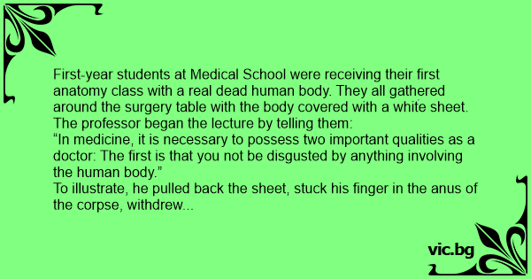 First-year students at Medical School were receiving their first anatomy class with a real dead human body. They all gathered around the surgery table with the body covered with a white sheet.