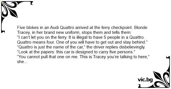 Пет германци во Audi Quattro застанале на италијанска граница. Италијанскиот цариник ги застанува и им вели: “Илегално е да се возите петорица во Quattro.“ - Како тоа мислите илегално?, прашал...