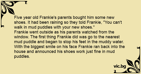 Five year old Frankie's parents bought him some new shoes. It had been raining so they told Frankie, "You can't walk in mud puddles with your new shoes."