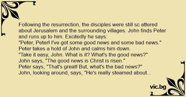 Following the resurrection, the disciples were still sc attered about Jerusalem and the surrounding villages. John finds Peter and runs up to him. Excitedly he says: