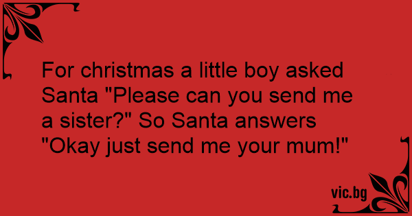 For christmas a little boy asked Santa "Please can you send me a sister?" So Santa answers "Okay just send me your mum!"