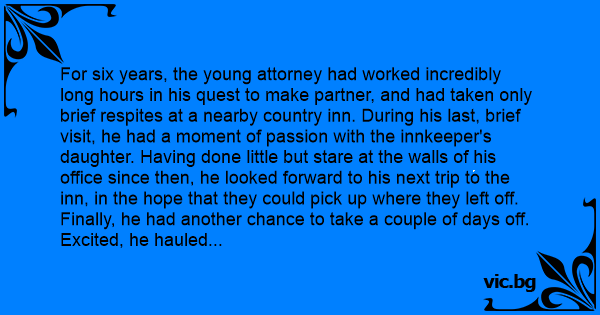 For six years, the young attorney had worked incredibly long hours in his quest to make partner, and had taken only brief respites at a nearby country inn. During his last, brief visit, he had a moment of passion with the innkeeper's daughter. Having done little but stare at the walls of his office since then, he looked forward to his next trip to the inn, in the hope that they could pick up where they left off. Finally, he had another chance to take a couple of days off. Excited, he hauled his suitcase up the stairs of the inn, then stopped short. There sat his lover with an infant on her lap! "Why didn't you call me when you learned you were pregnant?" he asked. "You know I would have have done the right thing, we could have been married. I would be a good provider."
