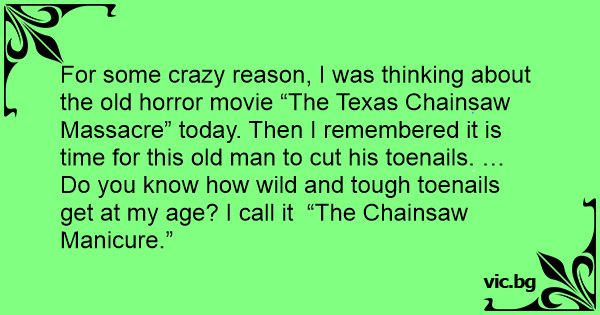 For some crazy reason, I was thinking about the old horror movie “The Texas Chainsaw Massacre” today. Then I remembered it is time for this old man to cut his toenails. … Do you know how wild and tough toenails get at my age? I call it “The Chainsaw Manicure.”