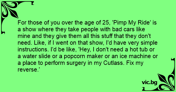 For those of you over the age of 25, 'Рiмр My Ride' is a show where they take people with bad cars like mine and they give them all this stuff that they don't need. Like, if I went on that show, I'd have very simple instructions. I'd be like, 'Hey, I don't need a hot tub or a water slide or a popcorn maker or an ice machine or a place to perform surgery in my Cutlass. Fix my reverse.'