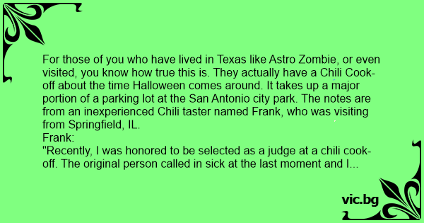 For those of you who have lived in Texas like Astro Zombie, or even visited, you know how true this is. They actually have a Chili Cook-off about the time Halloween comes around. It takes up a major portion of a parking lot at the San Antonio city park. The notes are from an inexperienced Chili taster named Frank, who was visiting from Springfield, IL.