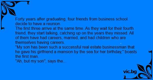 "My son has been such a successful real estate businessman that he gave his girlfriend a mansion by the sea for her birthday," boasts the first man.