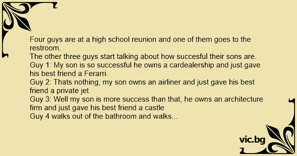 Guy 1: My son is so successful he owns a cardealership and just gave his best friend a Ferarri.