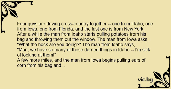 After a while the man from Idaho starts pulling potatoes from his bag and throwing them out the window. The man from Iowa asks, "What the heck are you doing?" The man from Idaho says,