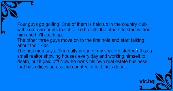 Four guys go golfing. One of them is held up in the country club with some accounts to settle, so he tells the others to start without him and he'll catch up.