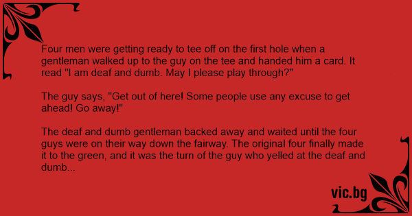 The deaf and dumb gentleman backed away and waited until the four guys were on their way down the fairway. The original four finally made it to the green, and it was the turn of the guy who yelled at the deaf and dumb gentleman to putt. He was lining it up, when suddenly 'Whack'! He got nailed on the back of the head by a ball and knocked unconscious.